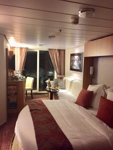 The stateroom I am in is so complete, it’s sometimes hard to drag myself out of it. It’s a snug 194 square feet but somehow manages to include a bath with spa shower, a queen-sized bed, a sofa and cocktail table, a mini fridge stocked with drinks both soft and hard, a desk, TV with amazingly good reception even in the middle of the sea, and pleasant lighting. And then there’s the 54