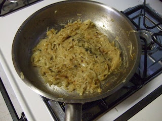 Heat over a moderate to low flame, uncovered, stirring every so often until the onions are golden brown and very soft. (About 1 hour). The thyme will have separated from the stems so fish out the thyme stems, leaving the bay leaves to be removed later.