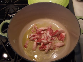 Put a large Dutch oven over medium heat and drizzle in 2 tbsp. of oil. Add the bacon and cook until crisp. Remove it to a paper towel; crumble when cool and set aside to use for the garnish. Season the beef with a generous amount of salt and pepper. Add the beef to the pot in batches. Fry the cubes in the bacon fat until evenly browned on all sides, about 8 to 10 minutes. Remove from the pot to a plate.