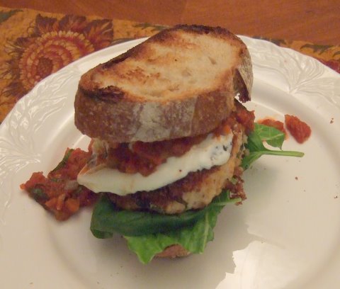 Now about the recipe for Chicken Parmigiano Burgers with Mozzarella and Marinara Sauce.  This is a riff on one  I saw in Bon Appetit this month and wanted to share with you.   I did change it mostly because I wanted to use more basil—at 3.99 a bunch that only seemed reasonable.  Also, I used lettuce that I had on hand.  Bon Appetit recommended radicchio—which is never a big hit in our house because of its bitterness.   I have had requests for some lower fat options in some of my posts and this one certainly fits that bill. They come in at 550 calories a piece and throw in a couple of grams of fiber.  They’re easy to make and a great way to satisfy a desire for a healthier option to a hamburger.  They don’t take much time at all and they do taste as good as they look.  Of course you can substitute regular hamburger buns for the French Bread but the bread does make this dish look fancy, don’t you think?   You can use store-bought marinara sauce and no one will know the difference.  Here’s the recipe: