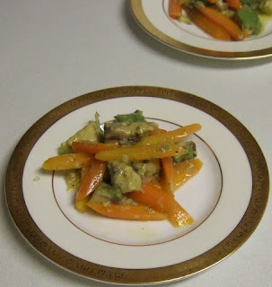 Olive Oil Poached Shrimp with Ginger-Tomato Sauce and Avocado and Carrot Salad