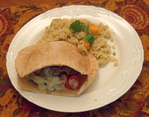 While The Breslin Lamb Burger is an exercise in restraint, I wanted to make mine a little spicier, to take it out of England altogether to another lamb eating area…like Turkey and the Middle East. I even did away with the Ciabatta opting instead for a much lower carb Pita. And instead of The Breslin’s Cumin mayo, I made a yogurt sauce with cumin, green onions, cucumber and Alleppo peppers. Then, with some halved grape tomatoes, I had a really satisfying and very different Burger. And it was absolutely delicious, served with some whole wheat couscous studded with carrots. Here are the recipes: