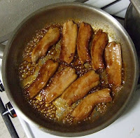 Arrange pork belly strips in caramel in single layer. Pour 1/2 C water over. Cook until water evaporates, turning pork occcasionally, 12-14 minutes. Add 1/2 cup more water. Cook until water evaporates again, turning pork occasionally, 12-14 min. Add 1/2 cup water one more time. Cook until pork is tender, deep brown, and crisp and water has evaporated again. Remove skillet from heat. With a slotted spoon, remove pork to plate. Cut each strip in 1/2 crosswise. Sprinkle lightly with salt and generously with pepper.