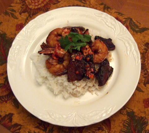Pork Belly, as you’ve undoubtedly noticed, is all over menus all over the place. And why not? It’s part of the bacon craze because Pork Belly is simply unsmoked, raw bacon. It was easy to find, organic and inexpensive at Whole Foods — $4.99 lb. So add to this dish ‘economical’ too. I served it on a bed of Jasmine Rice. Here’s the recipe: