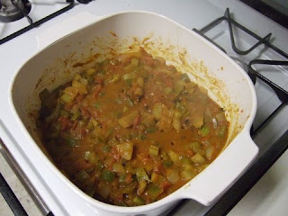 2. Discard oil and return dutch oven to medium heat. Add bacon and cook, stirring occasionally, until crisp, 7 minutes. Using a slotted spoon, transfer bacon to a paper towel–lined plate; set aside. Add the garlic, celery, peppers, and onions to the dutch oven and cook, stirring occasionally, until soft, about 10 minutes. Add tomatoes and their juice and cook, stirring frequently, until the juice thickens, about 10 minutes. Stir in the curry powder, butter, currants, and bay leaves and season with salt and pepper. Reduce heat to medium-low, cover, and simmer, stirring occasionally, until it thickens into a chunky sauce, 30 minutes.