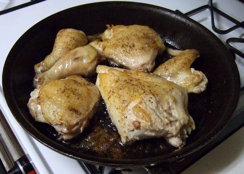 1. Season chicken with thyme, salt, and pepper. Heat oil in a large non-stick skillet or a 5-qt. dutch oven over high heat. Add chicken, skin side down, and cook, turning once, until golden brown, about 12 minutes. Using tongs, transfer chicken to a plate and set aside.