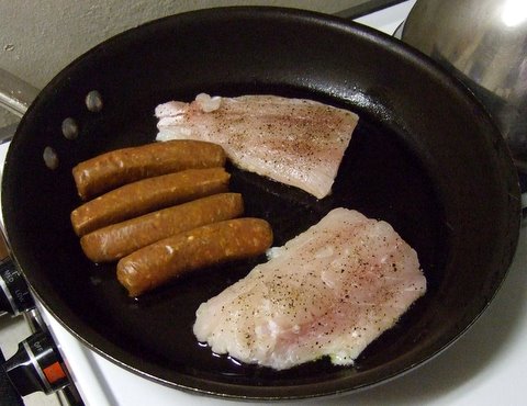 Season the fish fillets on both sides with salt and pepper. In a 12 inch non-stick sauté pan, heat the oil over medium high heat. Add the snapper and the sausage and cook until the fish is golden brown, about 3 minutes. Turn both fish and sausage and cook another 4 minutes until the other side of the fish is browned.