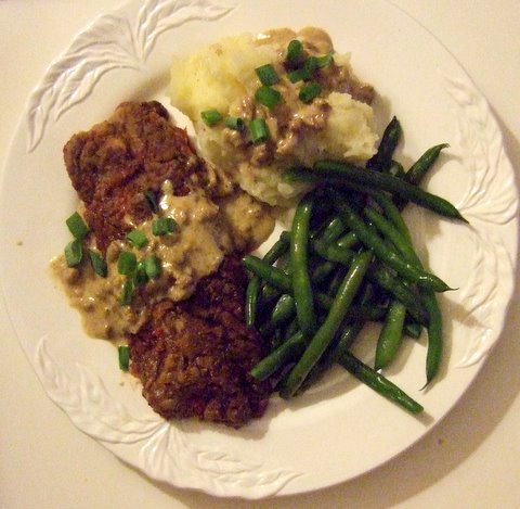 So now that I’ve gotten all that goodness off my chest, here’s the recipe for Chicken Fried Flank Steak with Country Gravy. It is an indulgence but I did try to keep things under control by using Chicken Stock in the mashed potatoes to keep the fat content down and I did serve it with Green Beans. However, not to go all holier-than-thou on you, I used a slab of Jone’s Pork Sausage roll which no one is ever going to call a health food. But we honestly enjoyed this dinner. And this morning, the scale hadn’t budged, I’m happy to say.