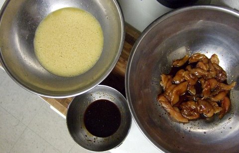 Since Tony is the Author of “150 Things to Make with Roast Chicken and 50 Ways to Roast It”, it’s no surprise that his Egg Foo Yung features strips of boneless, skinless chicken breast. While not roasted, the guy knows his way around a chicken. The preparation here isn’t complicated. You make the three liquid mixtures first and then go from there. I will admit, the cooking time is fast but I couldn’t bring this under 30 minutes. I’d say it took a good 45. There is considerable chopping and slicing. Here’s the recipe:
