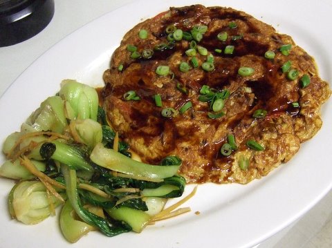 Wipe out the skillet with paper towels. Heat the remaining 2 Tbs. oil over medium-high heat until shimmering hot. Add the egg mixture, reduce the heat to medium, and cook, running a spatula in short, circular motions along the bottom of the pan, until the eggs begin to set, 2 to 3 minutes. Reduce the heat to low and gently press on the eggs with the spatula to flatten them. Cook until the eggs are just firm to the touch, about 2 minutes. Set a large plate over the pan and flip the eggs onto the plate so the bottom faces up. Drizzle with the oyster sauce mixture, sprinkle with the scallion greens, and serve. Serve with stir-fried baby bok choy seasoned with ginger and garlic.