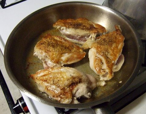 3. Season chicken with salt and pepper. Heat oil in a large skillet over medium-high heat. Add chicken, skin side down, in batches if necessary, and cook until skin is golden, 5 to 7 minutes. Turn and cook, until underside is slightly golden, about 3 minutes. Transfer to a baking pan, cover with foil, and place in oven.