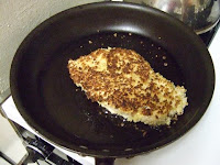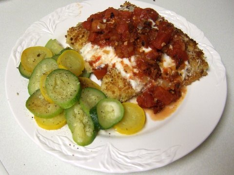 Who doesn’t need a weeknight supper they can get on the table in under 30 minutes?  This dish from Fine Cooking is a keeper.  It really was on the table in no time.  It’s got a lot of flavor and crunch.  It gives you the pleasure of fried food but it’s not.  It’s sautéed.  The secret here is Panko breadcrumbs.  These great Japanese imports are a terrific addition to any pantry.  They’re far superior to Italian breadcrumbs. You can even find them at Whole Foods in a whole wheat variety.  The other tip here is to use the recommended Muir Glen Fire Roasted tomatoes.  They really have a significantly better taste than ordinary diced tomatoes.  Of course, they’re organic but they’re only slightly more expensive than plain old diced tomatoes.  Then there’s the cheese.  Parmigiano is a staple at our house. I always have it on hand.