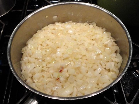 2. Put the onions into the bacon fat and cook at low heat until they are wilted and translucent but not browned. Add salt and pepper to the cooking onions.