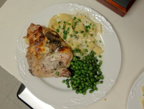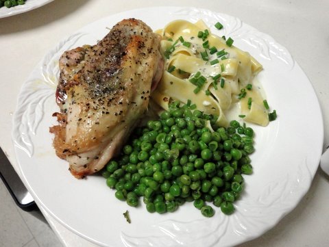 Now I started out wanting to go full-on Ina. Here’s what happened. Goat cheese is on Andrew’s no-fly list so I had to substitute it. Then Ina wisely recommended Cipriani’s tagliarelle which I love. Cipriani pasta is thinner than most, cooks in a flash and gives you this delicate lightness quite unlike most boxed pasta. No Cipriani at my grocery store but there was some nice Pappardelle that I would describe as being ‘semi fresco’—partially fresh. Ina used white truffle butter in her recipe for the pasta sauce. Scouring the dairy case I found none. But what I did find was truffled Fontina cheese and Garlic and Herb Butter. So I flipped ingredients and cooked the Chicken breasts stuffed with the truffled cheese. And I used the Garlic and Herb butter for the pasta sauce. They were beautiful together even if, as you can see, we had a slight problem tucking the cheese under the non-existent skin on one breast. My, it was good! So here’s to Ina! And here’s the recipe for one deluxe dinner: