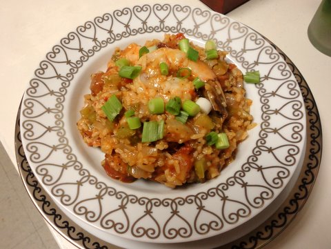 This version, which first appeared in Coastal Living magazine, is very easy to make and takes less time than you’d think—about 20 minutes to prep and 40 minutes to cook. It is greatly helped along by the use of cooked long grain rice. (Original recipes cooked everything but the rice and the seafood for about an hour when the rice was added for the another 30 minutes and the seafood for the last five.) I confess to cheating on the rice. I couldn’t see cooking rice separately so I went to a local Chinese restaurant where I bought a pint container of steamed rice. For $1.36, it seemed like a small price to pay for some labor saved. Even though this is a Creole version, I went a little Cajun. I upped the spice quotient with some McIlhenny Tabasco sauce. The McIlhennys has been making the sauce on Avery Island, Louisiana since 1868 where it still owned and operated by the same family. You can’t get much more authentic than that. Here’s the recipe: