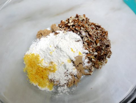 To make the topping: In a small bowl, combine the sugar, flour, pecans, butter ad orange zest. Mix it together until it is crumbly. Set aside.