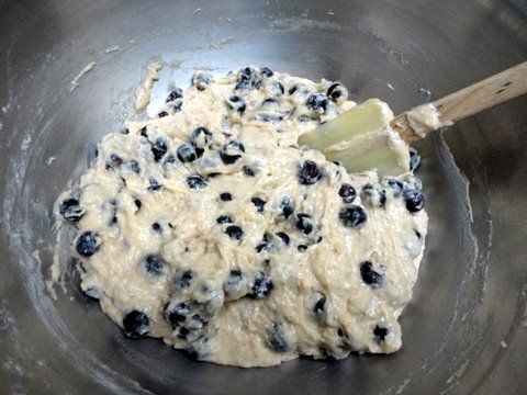 Toss the blueberries in flour to keep them in suspension in the batter.