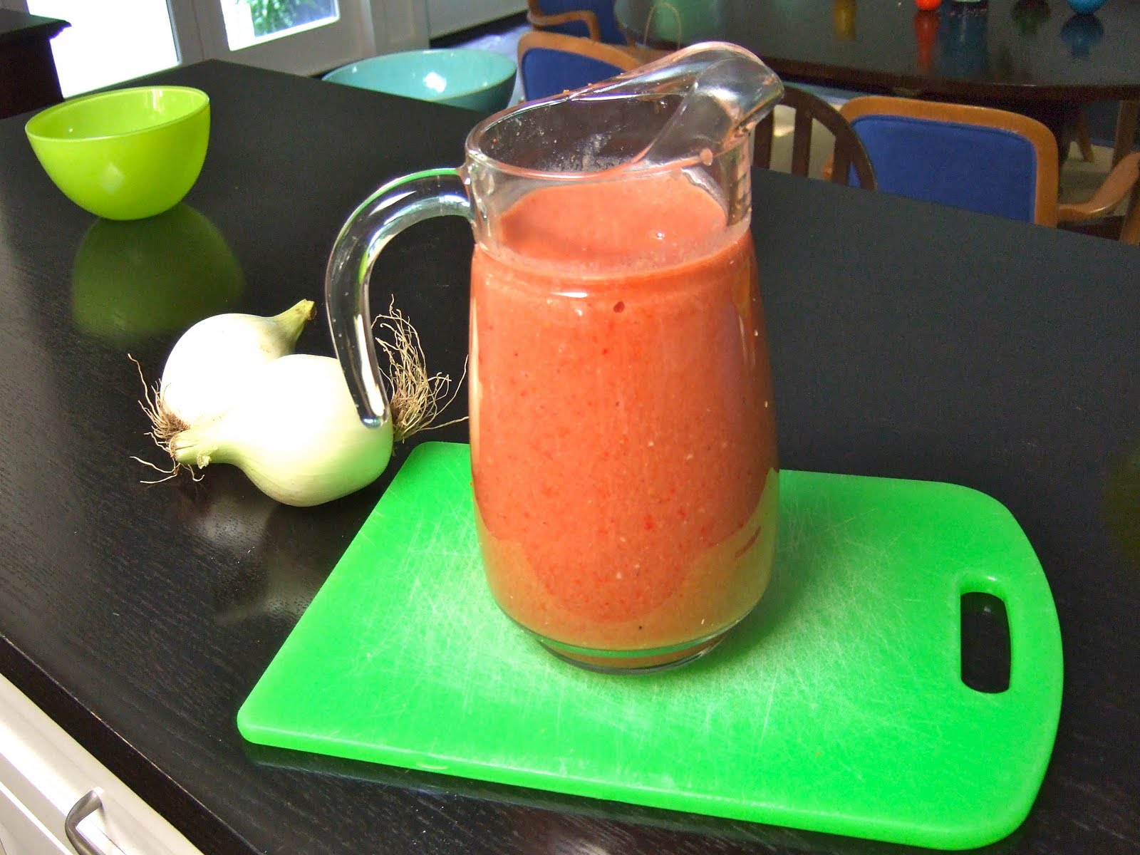 OK, so now I have made it two ways, one without the eggs and bread for the finicky hubby and one as per the recipe.. By the way, both versions do not come close to V-8 as a base, it's delicious and your right – so much lighter for our 100 degree + days, I just could kiss you and my food processor when it's lunchtime!!!