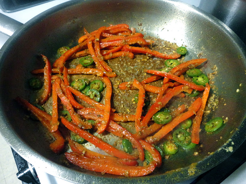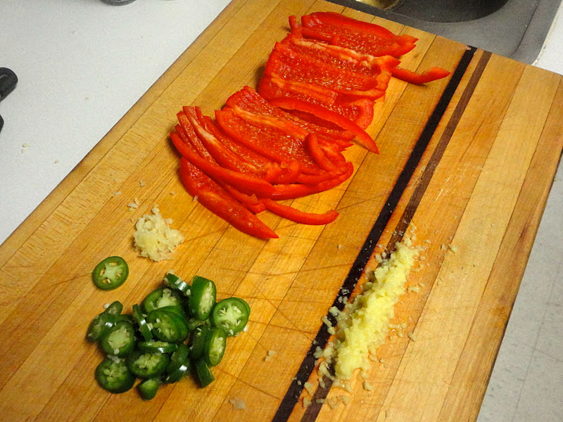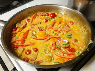 2. Add the ginger, garlic, chile and bell pepper to the skillet and cook over high heat until slightly softened, about 2 minutes. Stir in the curry powder and cook for 1 minute. Add the tomatoes, corn, yogurt and water; stir until smooth. Season with salt and pepper.