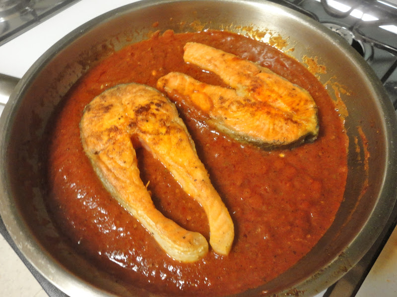 According to Bon Appetit, a traditional Jewish dish from North Africa inspired the recipe for Salmon Steaks in Spicy Tomato Sauce. Called “Chreime”, its roots may be in Morocco but it makes frequent appearances at Rosh Hashanah and Passover in Israeli celebrations. I wouldn’t wait for a holiday to serve this. It makes a perfect ‘meatless’ meal absolutely loaded with flavor. What’s wonderful too is that I bet you have everything you need to make it in your spice collection. I did have to make a major change from the version published in Bon Appetit. The first go-round, I followed their recipe to a Tee. I should have followed my instincts. There was no way I was going to have any kind of a tomato sauce from 2 tablespoons of tomato paste and ½ cup of water. What was I thinking? Just the illustration alone should have told me something was amiss. The adjustment I made was to forget the tomato paste and water altogether and substitute an entire 15 oz. can of Organic Tomato Sauce. Now I had something worthy of Yotam and Sami. And you will too. Here’s the recipe: