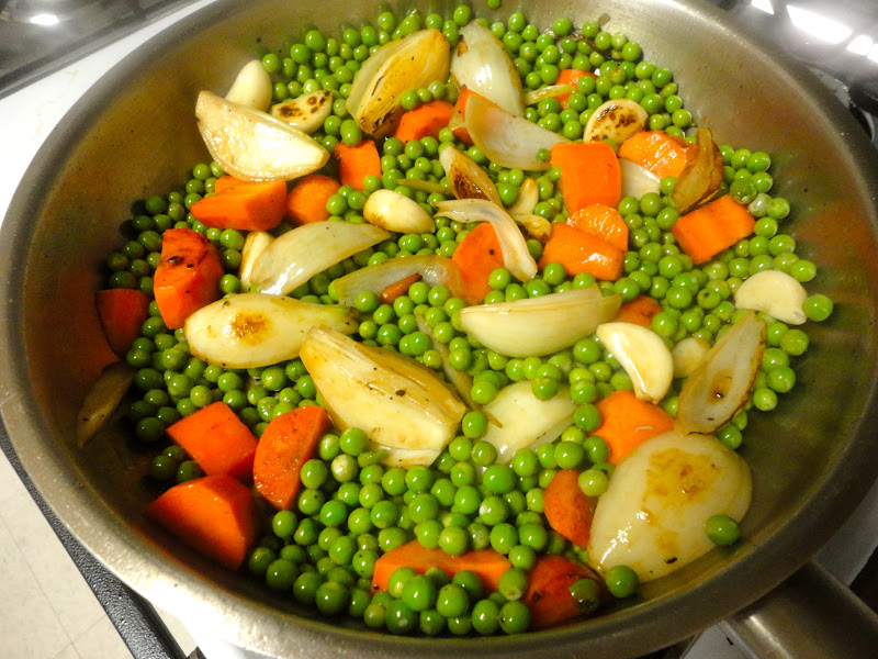 Reduce the heat to medium, throw in the onion, carrot, peas (thawed, if using frozen) and garlic, and cook, stirring occasionally, for about 4 minutes, or until nicely browned. Add the thyme, nestle the lamb on top of the vegetables, and pour in the wine.