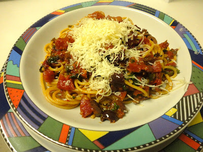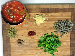 And how was the recipe? Mind-blowingly bland. But what do you expect when you put ¼ tsp. of Italian seasoning, ½ tsp. of seasoned salt in a two quart casserole? I mean if you take out the fat, the flavor carrier, please replace it with something to give some boost to your flavor profile. I confess that our dinner guest the night I served this dish more than enjoyed it. In fact he took all the leftovers home with him mostly because Andrew and I had had quite enough of our Light Baked Spaghetti. But what to make in it stead? That’s when I poked around and found Ellie Kreiger’s recipe for Pasta Puttanesca, a wonderful Roman dish adapted by Ms. Krieger, a dietician and host of the Food Network’s “Healthy Eating”. She has a master’s degree from Columbia University and an inate understanding of how to make healthy foods terrifically appealing. Here’s a quote from Ms. Krieger: “I crave food that is bursting with flavor and aroma, food that draws you in and leaves you satisfied and guess what? That food can also be healthy”.