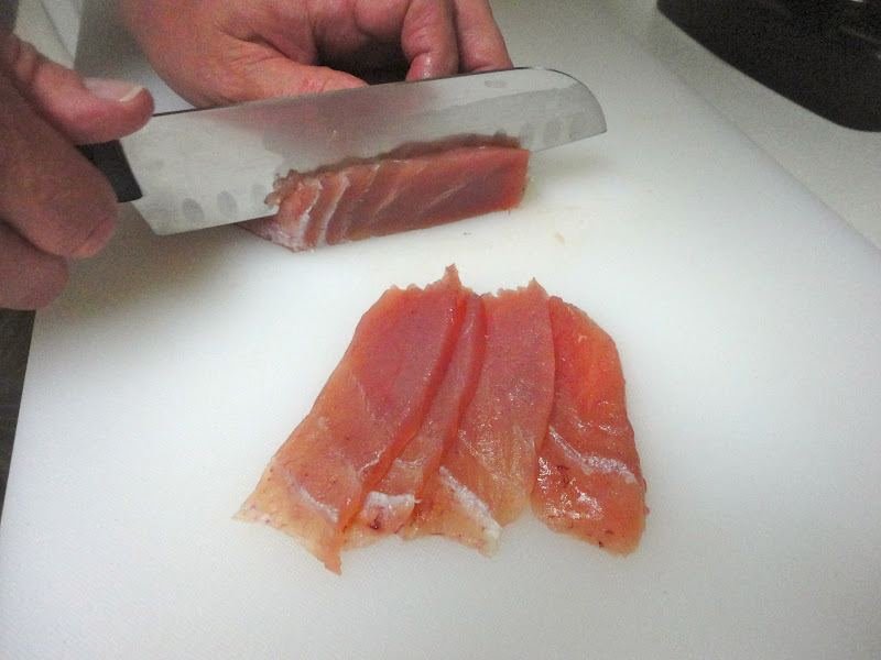 6. With a sharp knife, cut the tuna into pieces about 1/8 inch thick.