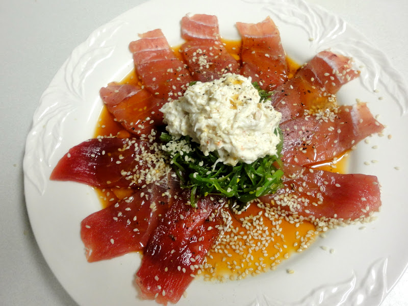 Putting your own “Tiradito de Thon” is extraordinarily easy as I discovered. The elements include beautiful slices of Sushi-grade dish tuna, which lie on a bed of Ponzu, the citrus flavored soy sauce that’s quite readily found in supermarkets. Slightly harder to find may be the Seaweed salad or “Hiyashi Wakame” which is then put centerplate over the tuna. I am sure that you can find it any Asian market, which is where I got mine. It is sold frozen and already dressed with sesame seeds and sesame oil, sugar, salt and chili oil. Topping the crunchy, delicious seaweed is a mound of lump crabmeat which I made creamy with sour cream and give a little heat to with some red pepper flakes. Toasted sesame seeds are showered over the whole dish and then a little sesame oil is drizzled over the fish. The whole thing is ready in minutes. All I can tell you about how good we thought our home version was to tell you this: Andrew expressed great disappointment that if I blogged about it, we wouldn’t enjoy this dish ever again. Fat Chance! I won’t let that happen. And if by any chance it does, we’ll be back at Bonito again next year. Here’s the recipe for 2.
