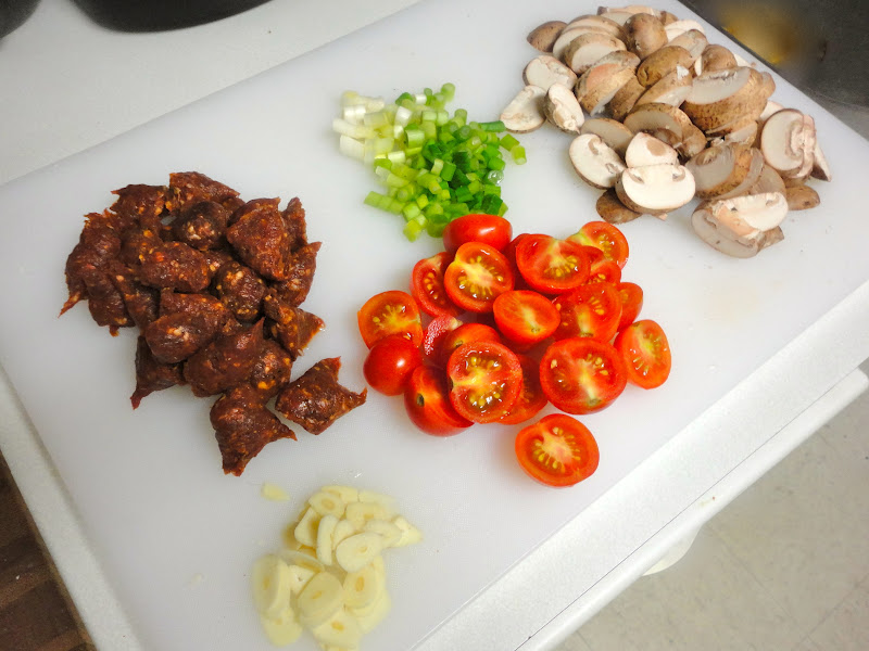·          Meanwhile, heat the olive oil in a large skillet over medium heat. Add the sausage and cook, breaking it up with a wooden spoon, until it begins to brown, about 3 minutes. Add the spring onions and cook until softened, about 3 more minutes. Add the garlic, mushrooms, 1/2 teaspoon salt, and pepper to taste; cook, stirring occasionally, until the mushrooms start to brown, about 3 minutes.