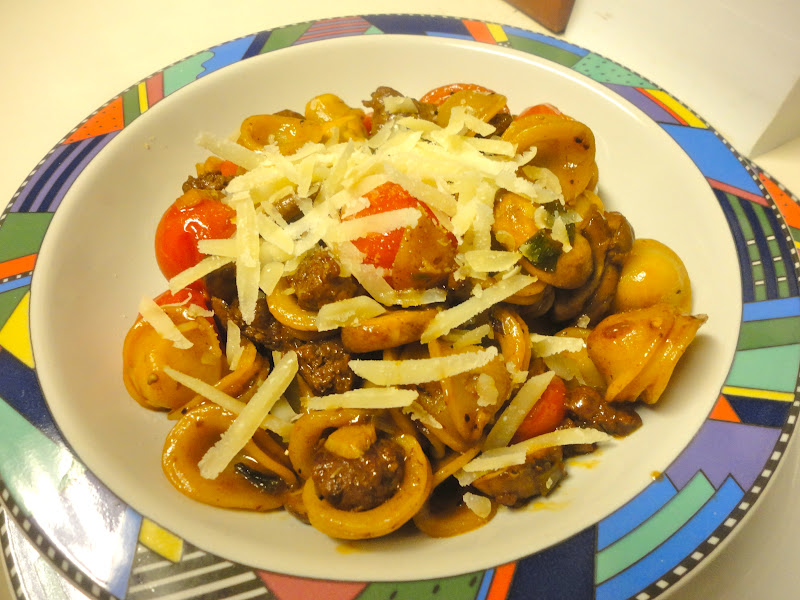 I’ve written about my fondness for Orecchiette before and this little pasta, which literally translates to “little ears”, made a perfect partner for my dish.  Orrechiette’s background is almost as interesting as what you can make with them.  They are thought to have been first invented in Provence, in France, where this type of pasta has been made since the Middle Ages.  In Italy, however, they are the pasta of Puglia, which is about as far from the French border as you can get in Italy.  As it turns out, the Anjou dynasty of France ruled Puglia in the 1200s hence the arrival of the earliest Orecchiette.