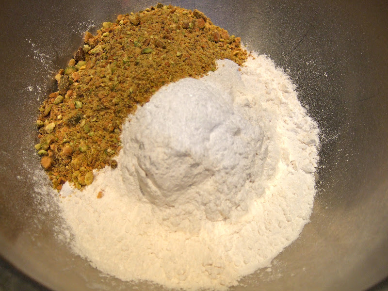 Building on the great success of his take on Kat McCleland’s Almond Cake, Andrew next wanted to take on pistachio nuts.  You can buy big bags of the things at Costco where they’re shelled for you and, like all things Costco, give you more pistachio nuts than one could ever imagine consuming.  He was intrigued by a pistachio cake recipe from a pastry Chef who has taken New York by storm.  He’d work with this chef’s recipes before to great success. Now this particular recipe called for one very specific ingredient: Pistachio Oil.  This was searched for high and low in our hyper-foodie neighborhood.  It was nowhere to be found locally. Finally it was located on line and sent for.  At enormous cost, the oil arrived.  The baking proceeded.  The results were not at all worth all the time, money and effort.  Sometimes chefs complicate things mightily. This particular chef, who shall remain nameless, had done just that.  But I couldn’t help thinking “would the cake have been declared a mistake had the pistachio oil been not so hard to find?”  I wonder.  But Andrew is not one to be derailed when he wants to bake something.  Especially not when he was confronted with all those leftover pistachios.