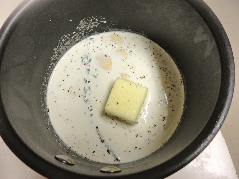 Meanwhile put a separate medium to small heavy based saucepan, add to it: heavy cream, unsalted butter, thyme, garlic, salt and pepper. Bring gently to a boil, and then turn the heat off. Let the cream mixture steep for 15 minutes or longer. Keep warm.
