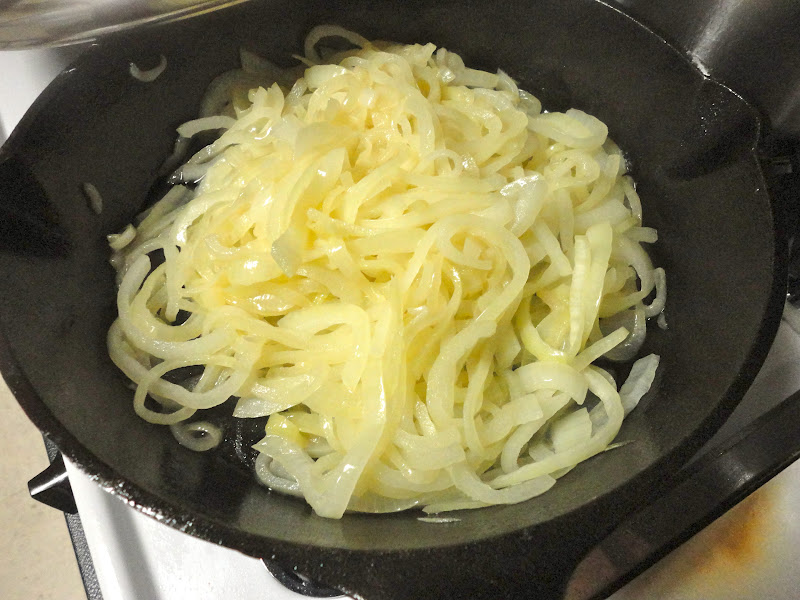 Meanwhile, add 2 tablespoons of more of unsalted butter and the yellow onions to the frypan,. Stir over medium heat until the onions are softened and fragrant, not browned. Add raw or brown sugar and about a quarter cup of water (and a few leaves of fresh thyme—optional). Add a tablespoon of all purpose flour and stir until nutty and just golden.