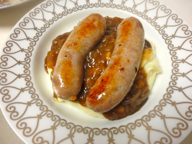 the editor of the on-line magazine “Real Eats”. Now Bangers and Mash is what the English have dubbed a dish of Pork sausages and mashed potatoes. The reason for the moniker “bangers” is because the sausages were packed with water so that when they went into a hot pan, they split and went “bang”. Since I cooked my sausages entirely in the oven, if there was any banging, it was out of earshot. But the dish was a huge success. The lovely onion-y, beefy gravy coats the sausages which sink into the mashed potatoes. And oh what mashed potatoes! They’re light as all get out despite frightening amounts of cream and butter, the lovely scent of whole garlic and a cream infused with fresh thyme. They are the best mashed potatoes I have ever eaten. There are two secrets here. The first is to use a ricer or food mill. Forget that tired potato masher. You will never achieve anything like the silky smoothness with one. And the second secret is that the potatoes themselves should be as dry as possible. The recipe follows.
