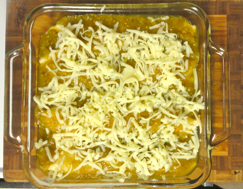 Pour green enchilada sauce over all of the enchiladas; the green sauce should cover the enchiladas completely. Sprinkle the remaining cheese over the enchiladas.