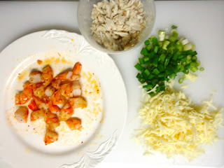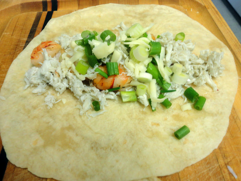 Lay tortillas on a flat surface. In the middle of each tortilla place equal amounts of cheese, crab, and shrimp. Add half the green onions. Set aside some cheese to sprinkle on top of the tortillas. Roll the tortillas to form enchiladas. Arrange side by side in a 9×13 inch baking pan.