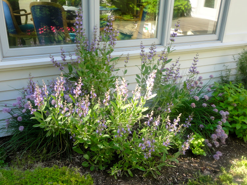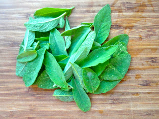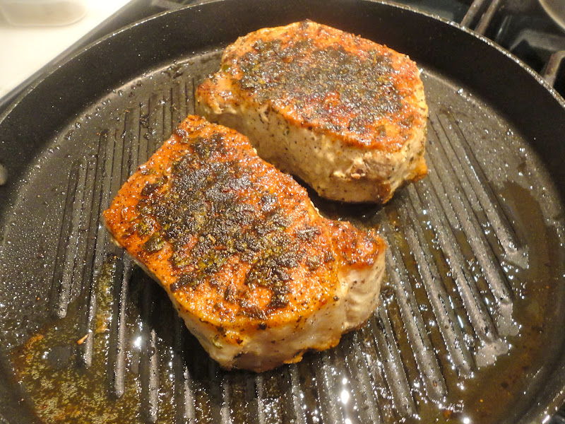 We have the most beautiful Sage growing right outside our breakfast room window.  It’s currently in full flower as you can see.  Once the flowers are over, we’ll cut it back severely and it will come back like crazy.   It was a no-brainer to use it.  And what a simple technique!  You put a little olive oil in the bottom of a pan, cover it will chopped sage then the pork chops themselves, then more olive oil and more sage.  It sits for about an hour before cooking.Now you can do this entirely on the stovetop or on the grill.  But our chops were particularly thick – almost two inches – and since the oven was in service to make the roasted asparagus, finishing them in it made sense. Once the chops had achieved a perfect brown, you just put them in the oven for about 10 minutes and voila—that’s it!