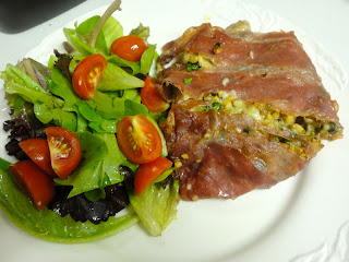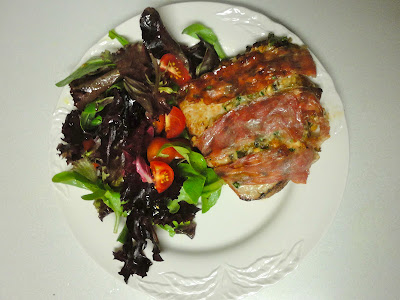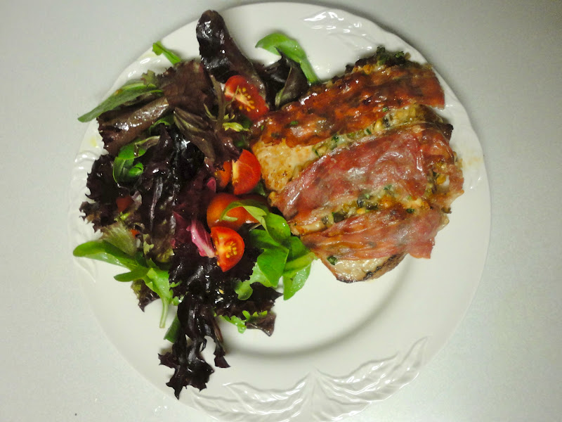 For years I’ve wondered why anyone would buy those thin, small, boneless pieces of pork called cutlets of even pork chops. Why would anyone choose those over a big 1 ½ to 2 inch pork chop as thick as a steak? So I stuck to the tried and true and bought two chops that were not as thick as my preferred ‘Pork Steak’. They were frenched and under an inch thick. Following the recipe, when I pounded them down to the correct thickness, 1/3 inch, the bones detached themselves from the pork so in essence I was working with the recipe recommended ‘cutlets’. Of course they were larger and each required every slice of prosciutto called for in the original recipe for 6 servings.