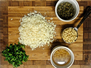 Finely chop together nuts, raisins and capers. In a bowl, stir together nut mixture, cheese and parsley.