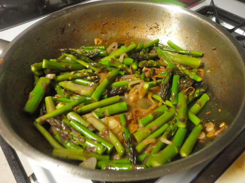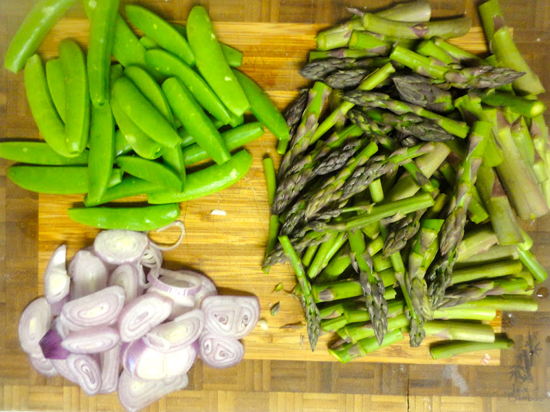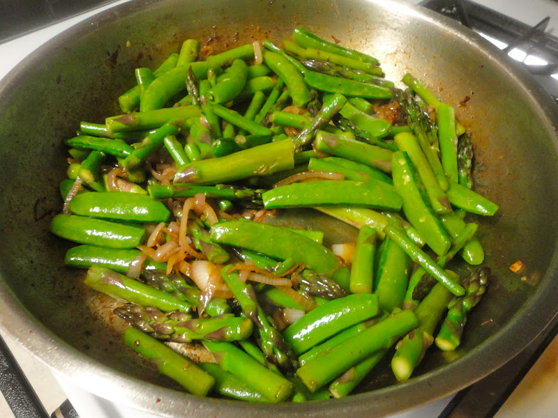 Add the other tablespoon of oil to the pan, and cook the shallots until they have softened, 2 to 3 minutes. Add the asparagus, cook for another 30 seconds to 1 minute, and then add the sugar snap peas. Pour half of the water into the pan, and scrape the bottom of the pan to pick up browned bits. You may need to add all of the water, depending on how high the heat and how brown your pan.