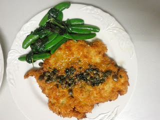 The secret here is the panko, the Japanese bread crumbs that beat all others when you want a really crunchy crust. You can buy them virtually everywhere now. Whole Foods even has a Whole Wheat version for the sanctimonious among us. A word of caution: This dish cooks so quickly, make sure whatever side dish you’ll serve with it is ready to plate once the chicken is done. Chef Keller served his Chicken Schnitzel with a simple green salad. I chose Sugar Snap Peas and added some greens. But the star of the show is unquestionably the Schnitzel. Try this one, it’s a keeper. Here’s the recipe: