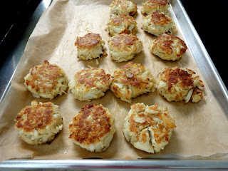 Take the crab cakes out of the refrigerator. Heat 3 tbsp. of olive oil in a large sauté pan over medium heat. Add the crab cakes, in batches, cooking each for about 4 minutes a size. Take care in turning the cakes over. Place the finished crab cakes on a parchment paper lined sheet pan and place in warming oven or cooled oven used for roasting the corn.