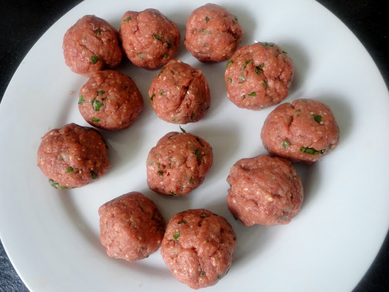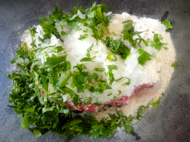 Put the meat in a large bowl with the grated onion, parsley, egg and matzo meal. Blend well with your hands and then add the tomato juice, cinnamon, nutmeg and coarse salt to taste. Knead well. Add 1 tbsp. oil and knead again, until the mixture becomes a smooth paste.