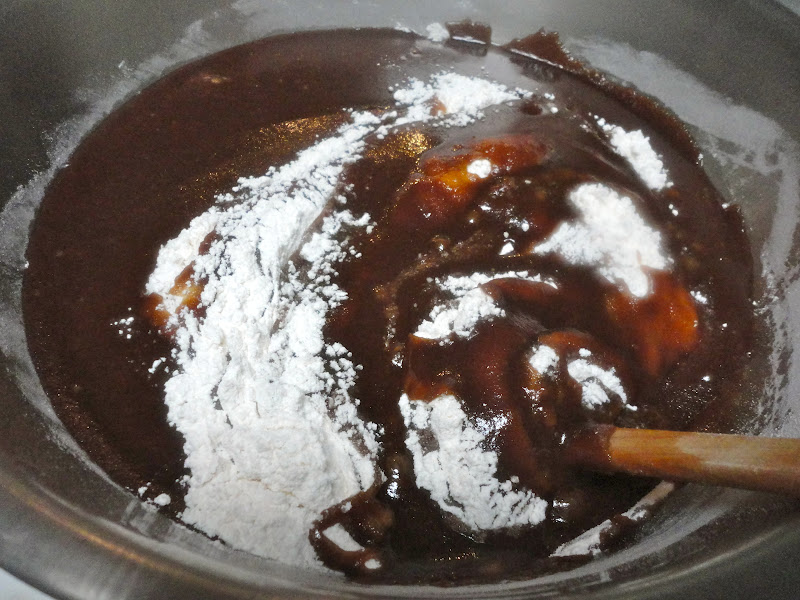Pour the butter-sugar mixture into the flour mixture and stir until combined.