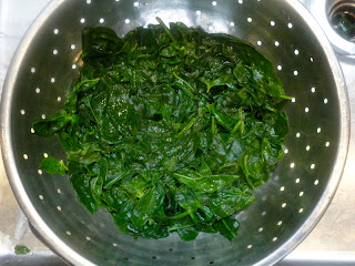 Dump the spinach and basil into the boiling water and stir. After 1 minute, strain the greens, and plunge them into the bowl with ice water. Drain the greens again and squeeze them tightly to get as much water out as possible. Chop the greens roughly.