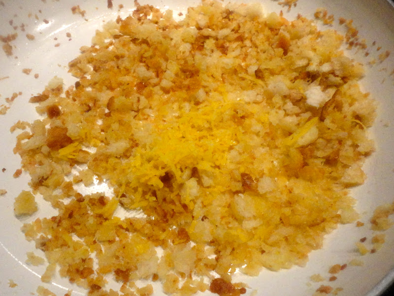Meanwhile, heat 2 tablespoons of the olive oil in a large skillet. Add the bread crumbs and cook over moderately low heat, stirring, until golden and crisp, about 5 minutes. Stir in the lemon zest and a pinch of crushed red pepper and season with salt. Transfer the crumbs to a bowl and wipe out the skillet.