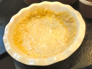 Either grease a 9 inch pie plate or spray it with non stick cooking spray.