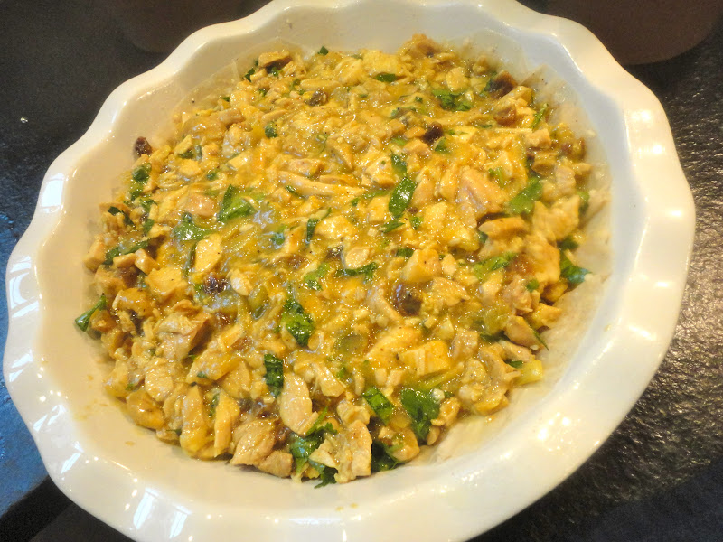 Add nuts, raisins, parsley and cinnamon to chicken/onion mix; mix lightly.