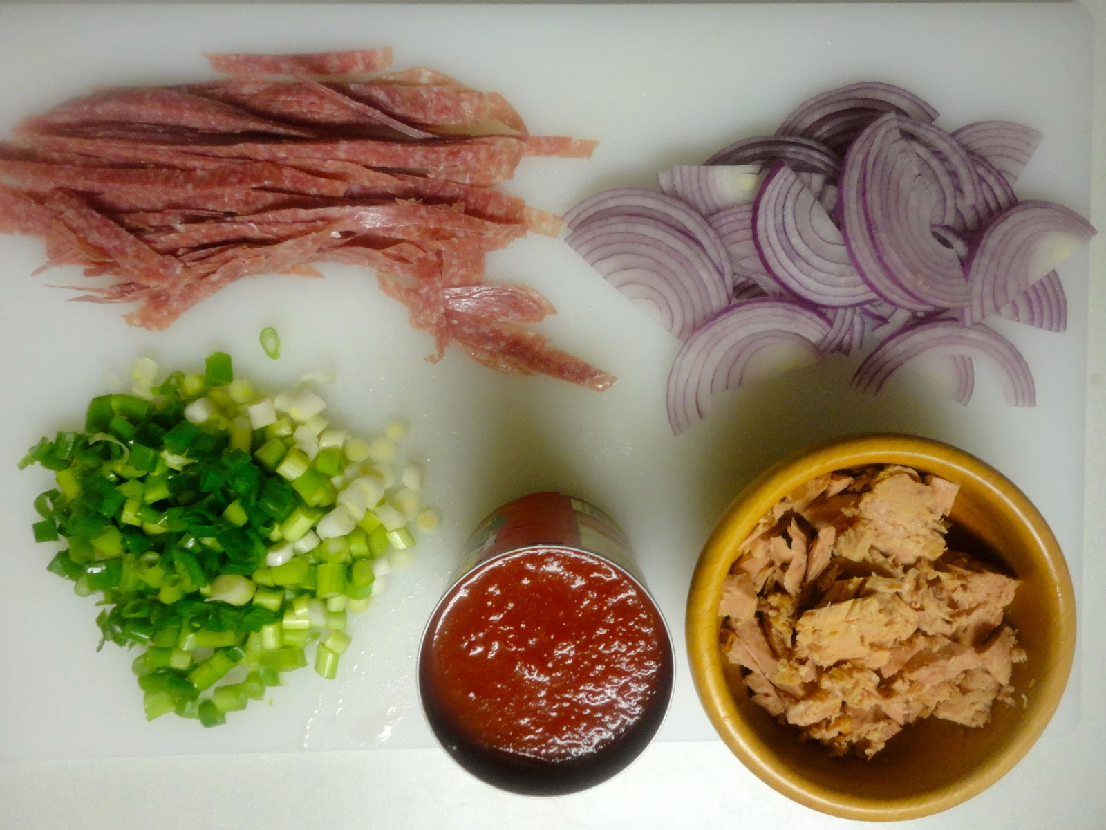 • When Valery asks "Can you make this again tomorrow?", I know we have a winner. This was simply delicious and as promised, so very easy to make. I used a spicy Italian tuna packed in oil, and sauteed the onions and salami in that oil instead of olive. This gave the dish a boost of heat! I would not do this again if serving for guests with a lower heat tolerance than mine however we quite enjoyed it!
