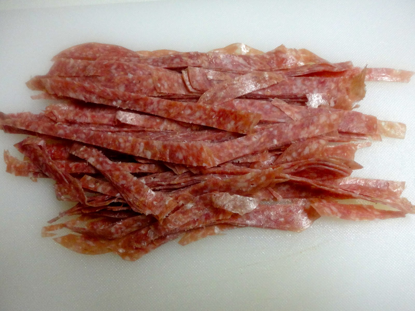 But it turns out that it’s a method of turning canned tuna into a ‘log’, which is then sliced like salami.  The resulting “Tonno Salame” is sometimes then made into a topping for boiled potatoes.  As I probed a little deeper, I came across a recipe for Spaghetti with Tonno e Salame. Written by a woman named Marina Rubino, it appeared on an Italian site called www.ricettedicucina.org.  Similar to the aggregators of recipes in this country, ‘kitchen recipes’ as it is translated, has dozens of contributors like Ms. Rubino.  But Ms. Rubino appears to be an original. The comment left by one reader translates to “With all the recipes that you publish, I am coming to think that you are a brave cook” Well, she actually wrote “Brava cuoca ” which is closer to “good cook”.  Her recipe however veered sharply away from Mario Batali’s. It used chucks of dried salami, cherry tomatoes and canned tuna. And they remained individual ingredients when they came together. Chef Batali’s version, as you can see, is a blending of all the ingredients to create a sauce that is simultaneously spicy from the salami, sweet from the tomatoes and full of body from the tuna.  He too must be complemented for being an original. “Uno Bravo Cuoco” as we say in Italian. I wonder how this would taste with plain old American tuna in oil. It sure would be worth a try. Here’s the recipe: